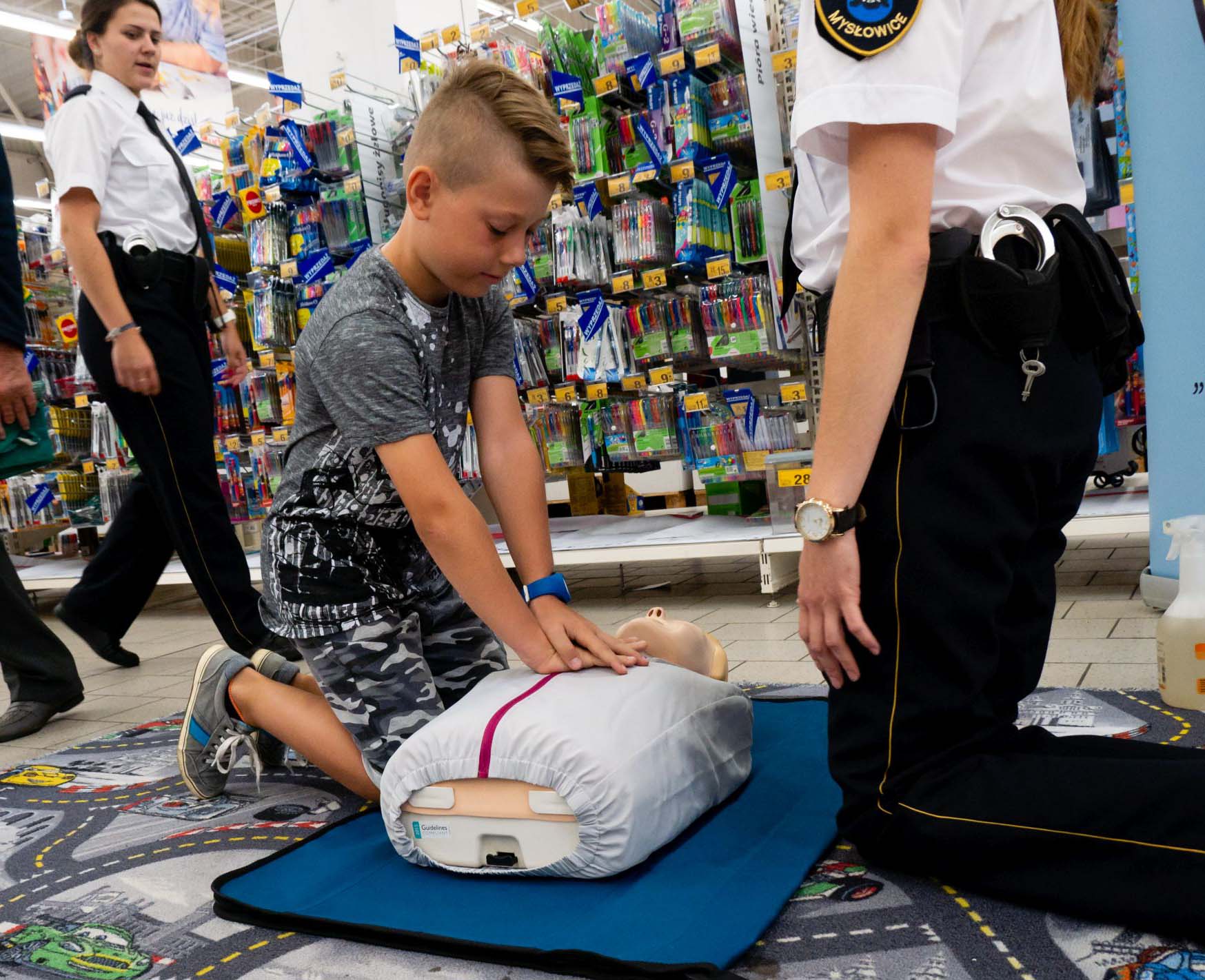 Podczas zajęć dzieci uczą się rozpoznawać sytuacje zagrażające życiu i zdrowiu. Poprzez wspólnie odgrywane scenki ćwiczymy powiadamianie odpowiednich służb. Następnie zapoznajemy uczniów z pozycją „koszyczek” oraz „boczna bezpieczna”, które praktycznie przyswajają w parach. W trakcie realizacji programu dzieci zapoznają się z zasadami przeprowadzenia RKO na fantomach. Wykorzystujemy również ćwiczebne AED.