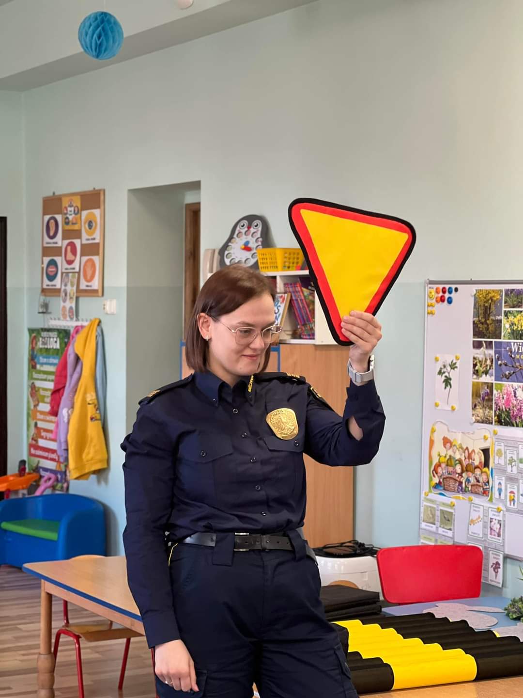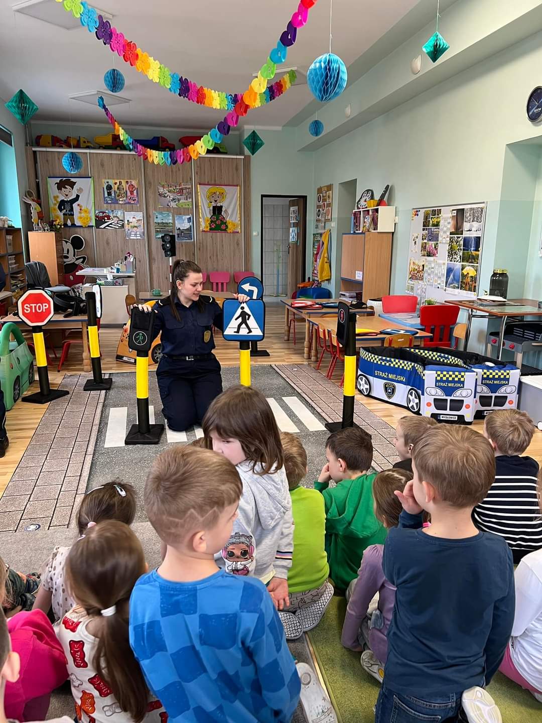 Strażnicy zaprezentowali dzieciom wiele zagadnień dotyczących bezpieczeństwa w ruchu drogowym – rozpoznawanie świateł i reakcja na nie, dbanie o swoje bezpieczeństwo w czasie przechodzenia przez przejście dla pieszych oraz podczas poruszania się chodnikiem.