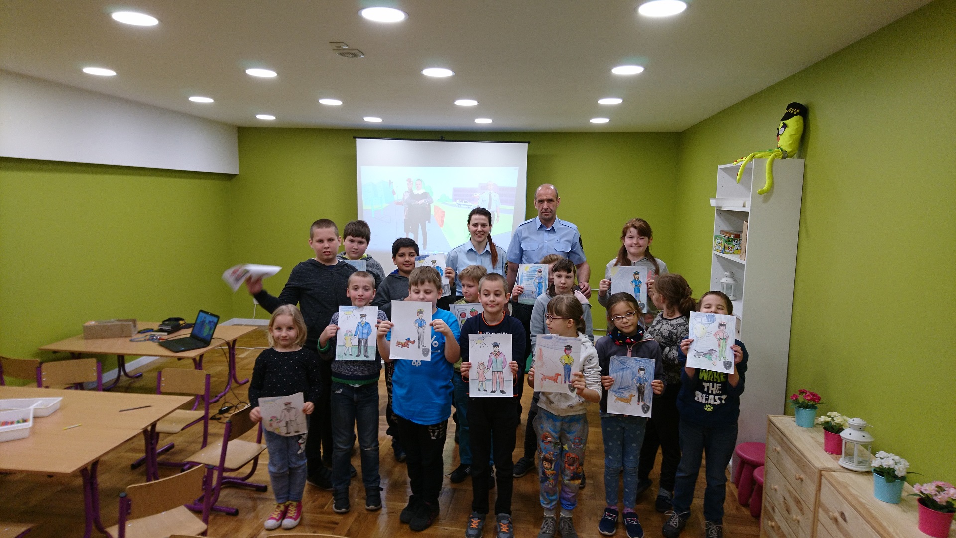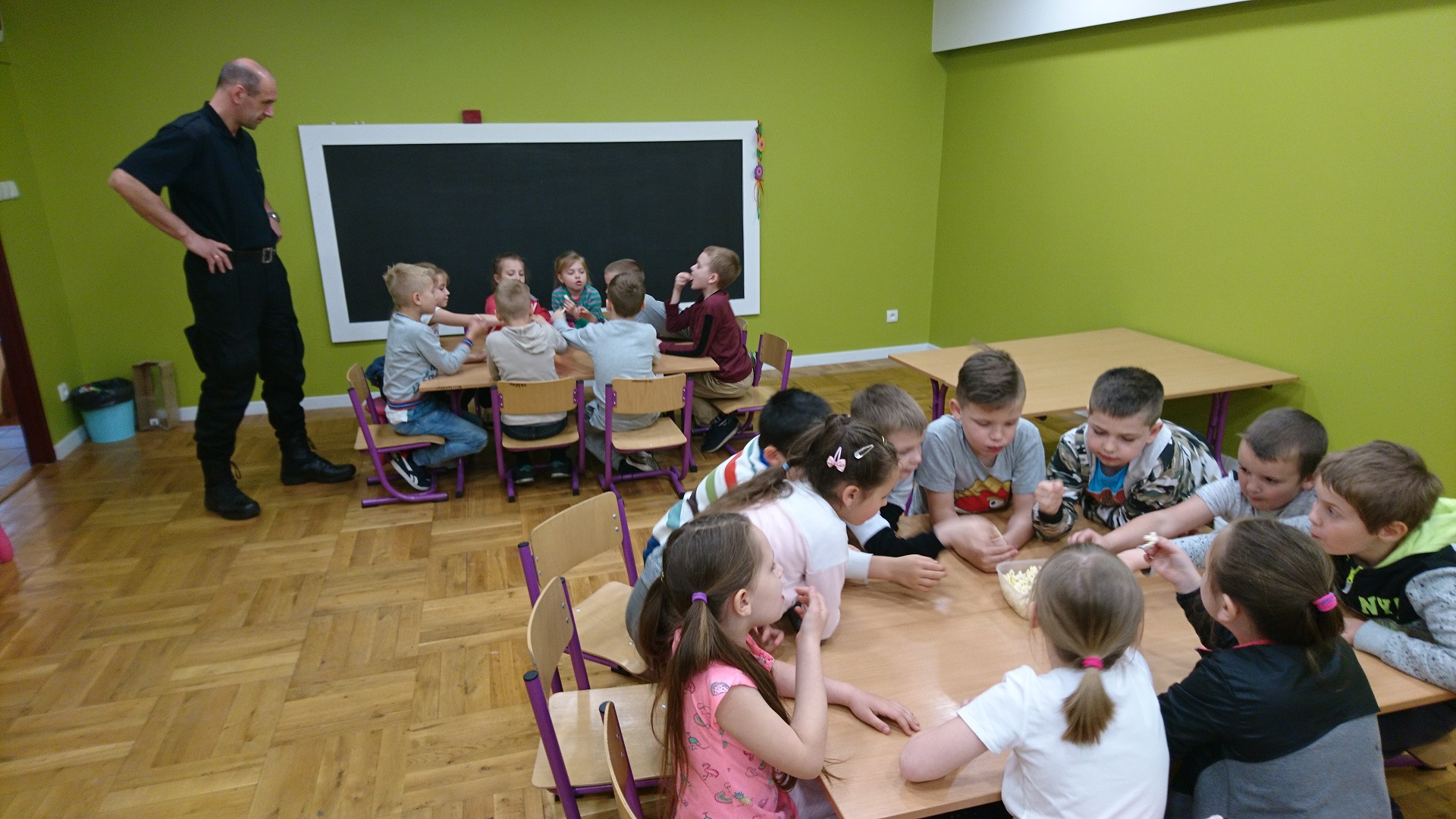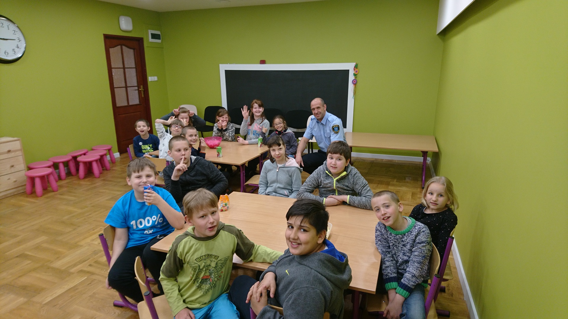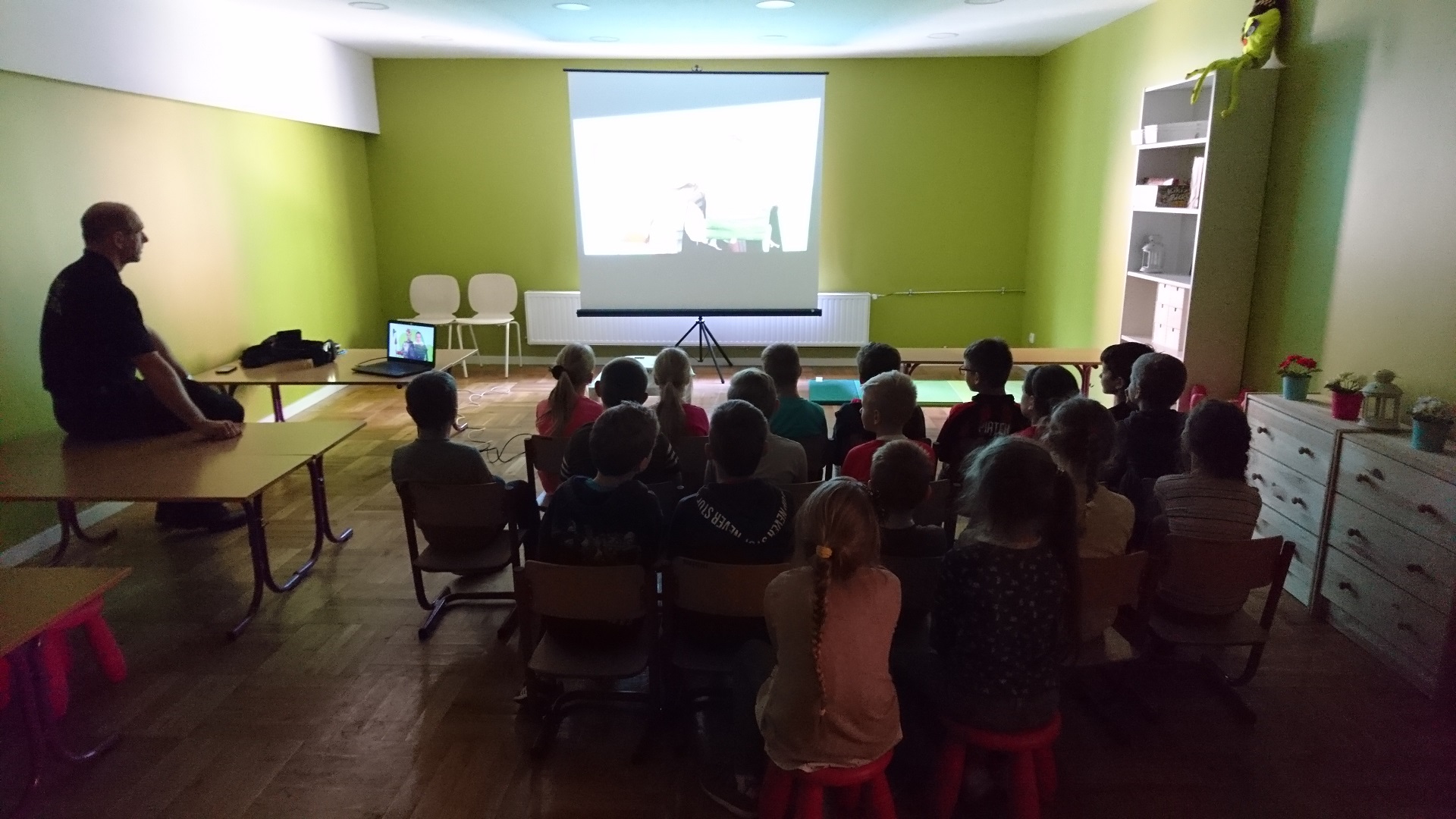 Dzieci uczestniczyły w zajęciach profilaktycznych prowadzonych w świetlicy straży miejskiej. Wszystkie klasy w ramach realizacji cyklu „Kino ze Strażą Miejską Mysłowice” brały udział w programie o nazwie „ Florka”. Głównym celem programu jest przypomnienie i utrwalenie uczniom zasad bezpiecznego zachowania wobec osoby nieznajomej. W trakcie zajęć wyświetlany jest film edukacyjny, podczas którego strażnik miejski omawia mogące się wydarzyć sytuacje oraz podaje sposoby na uniknięcie zagrożenia. Uczniowie poprzez zabawę umiloną wspólnym jedzeniem popcornu uczyli się jak być bezpiecznym.