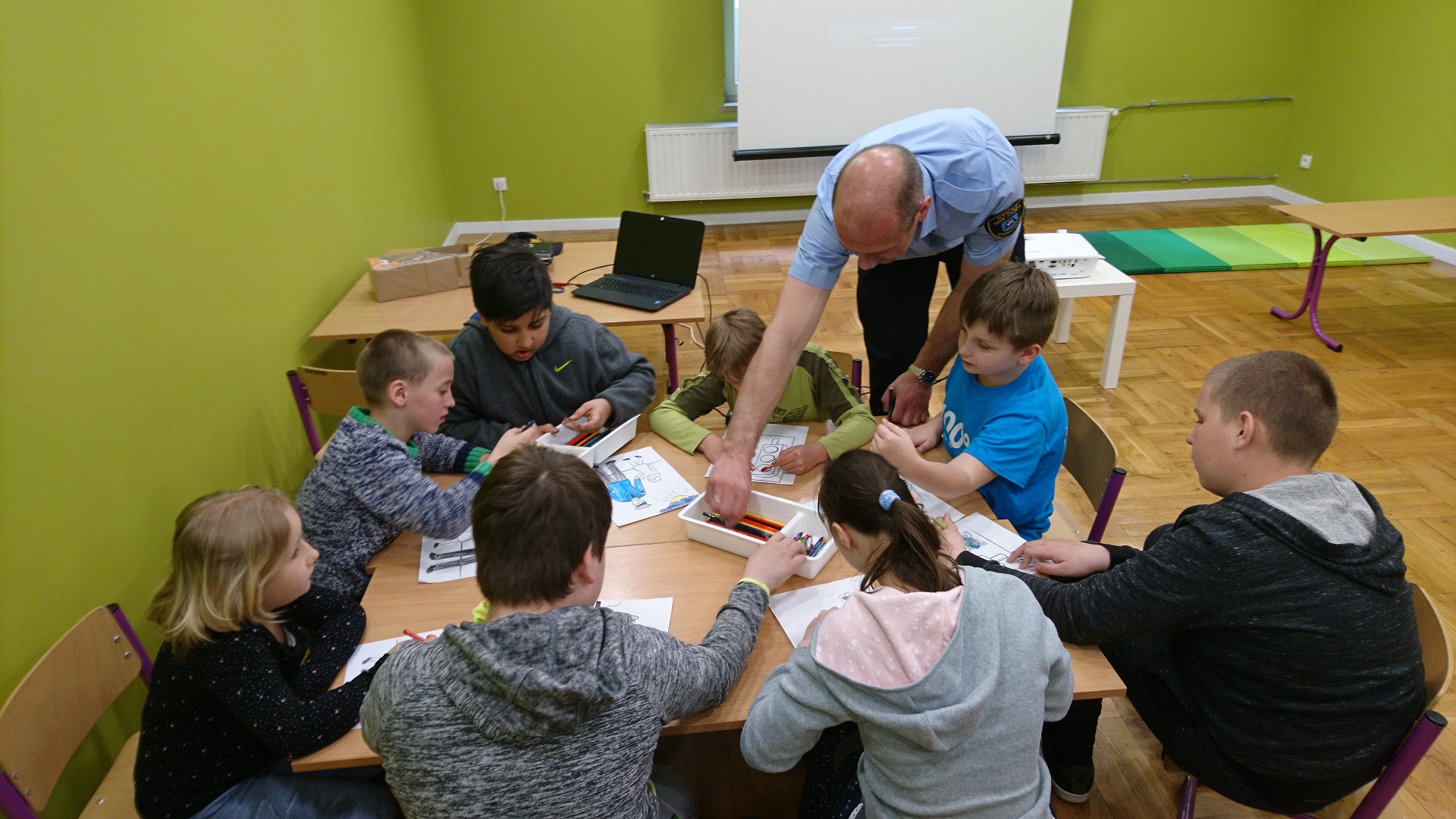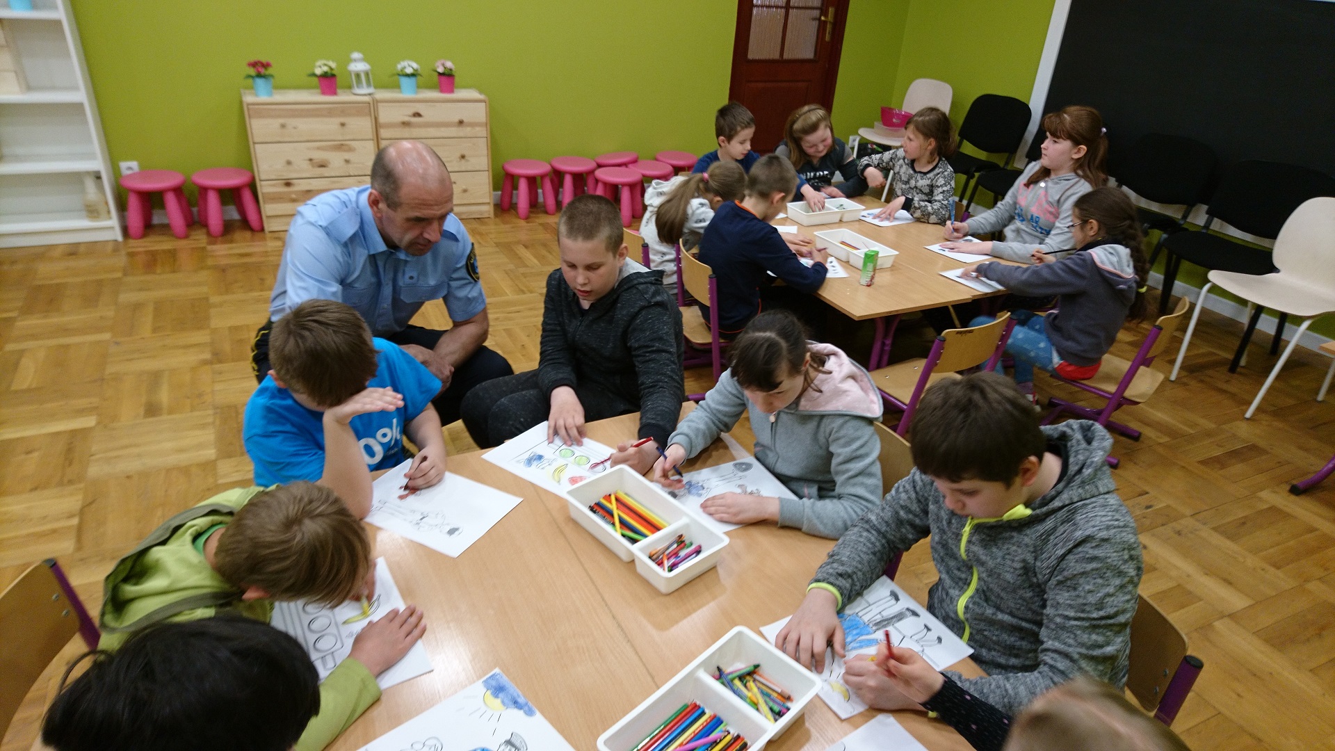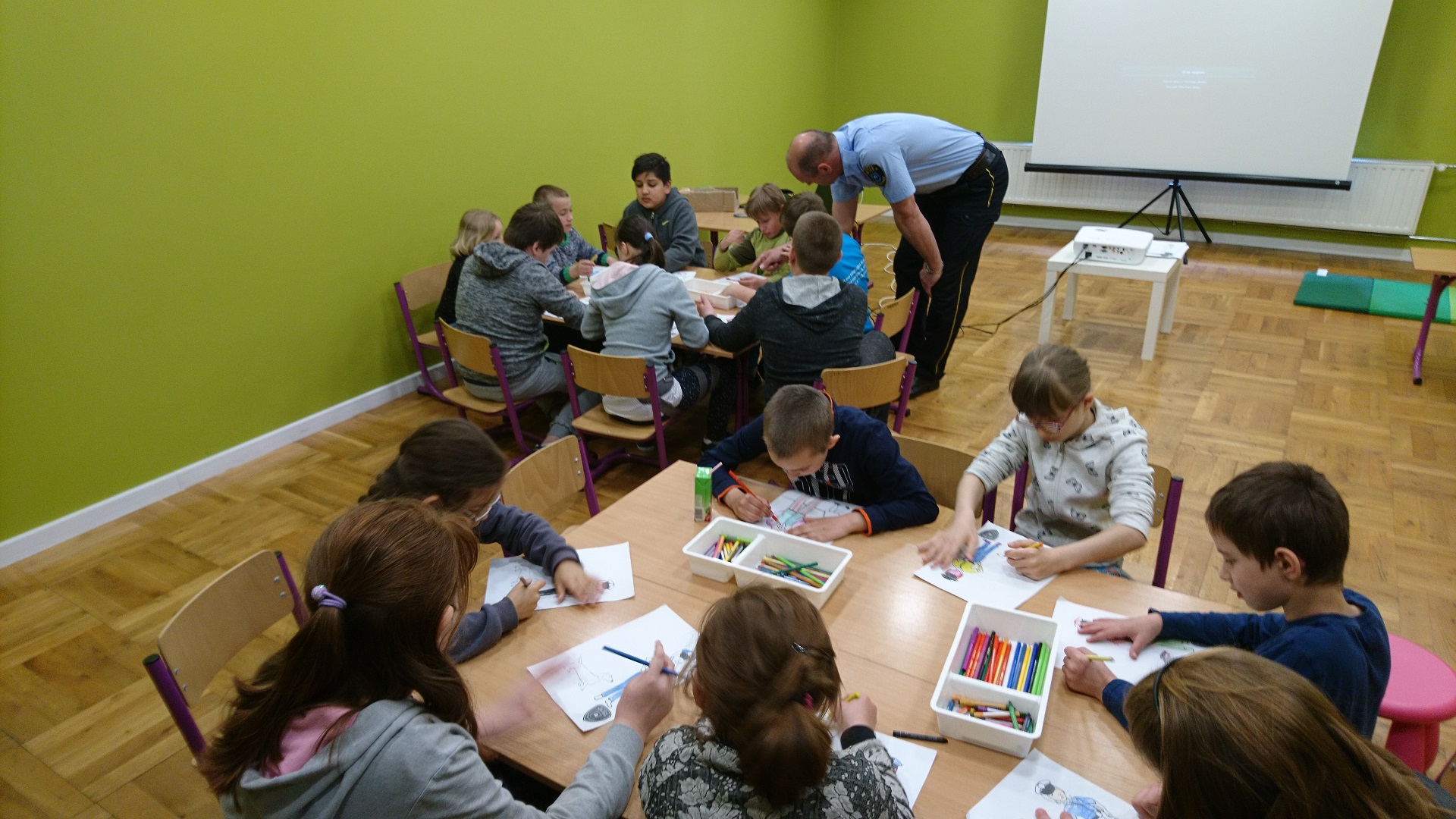 Dzieci uczestniczyły w zajęciach profilaktycznych prowadzonych w świetlicy straży miejskiej. Wszystkie klasy w ramach realizacji cyklu „Kino ze Strażą Miejską Mysłowice” brały udział w programie o nazwie „ Florka”. Głównym celem programu jest przypomnienie i utrwalenie uczniom zasad bezpiecznego zachowania wobec osoby nieznajomej. W trakcie zajęć wyświetlany jest film edukacyjny, podczas którego strażnik miejski omawia mogące się wydarzyć sytuacje oraz podaje sposoby na uniknięcie zagrożenia. Uczniowie poprzez zabawę umiloną wspólnym jedzeniem popcornu uczyli się jak być bezpiecznym.