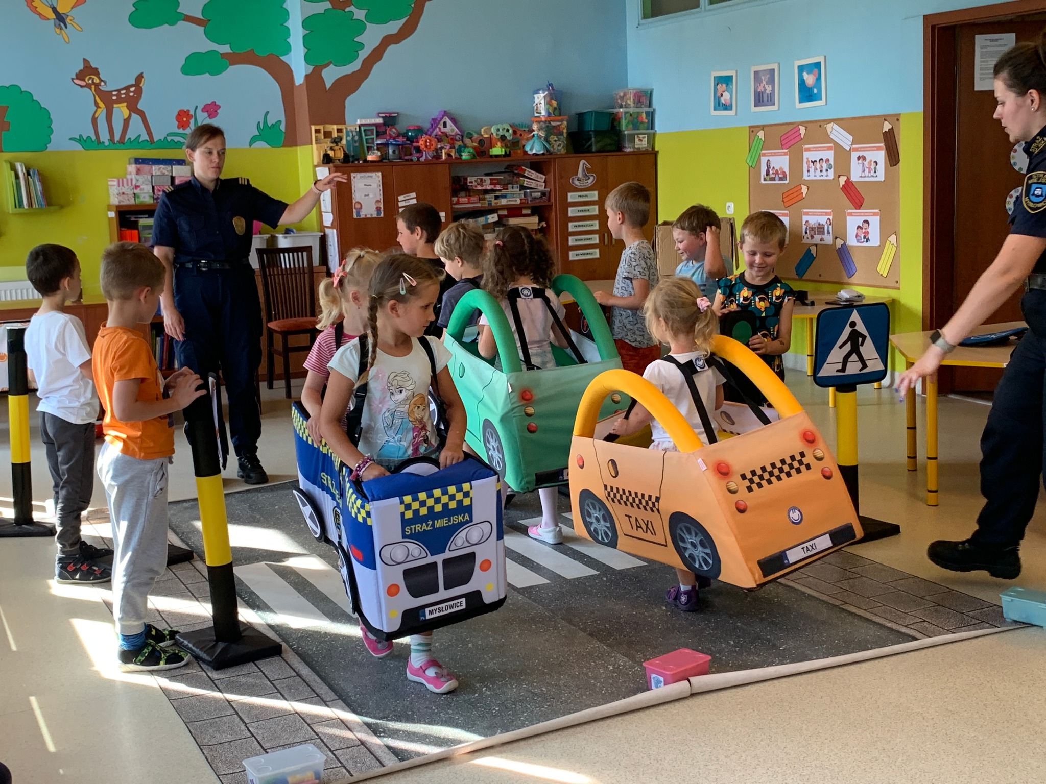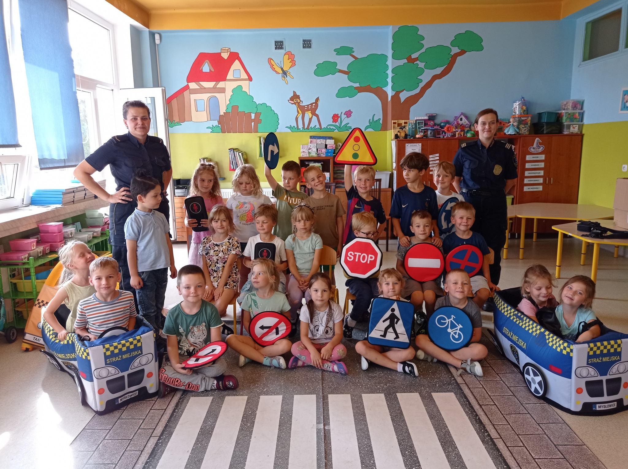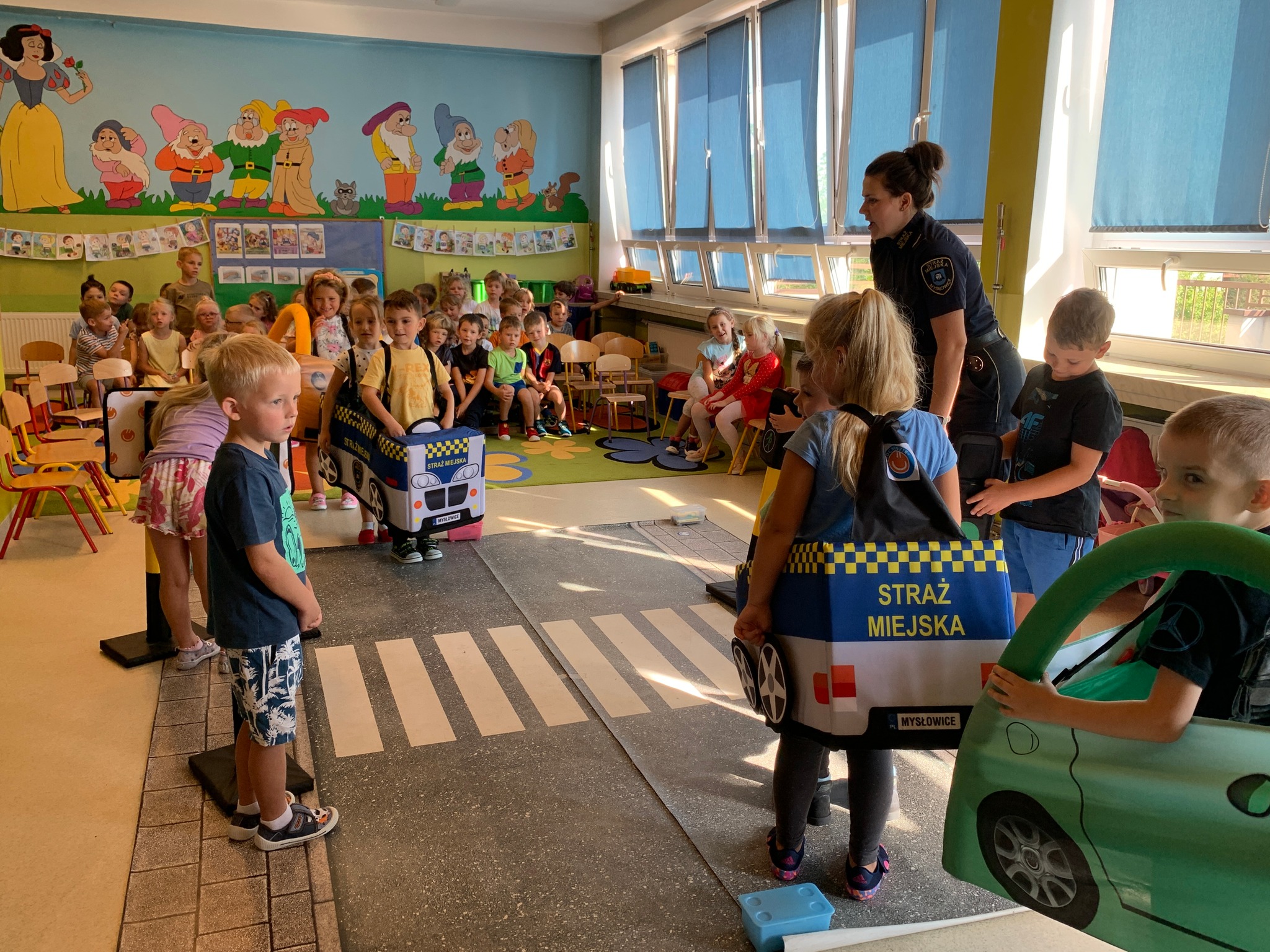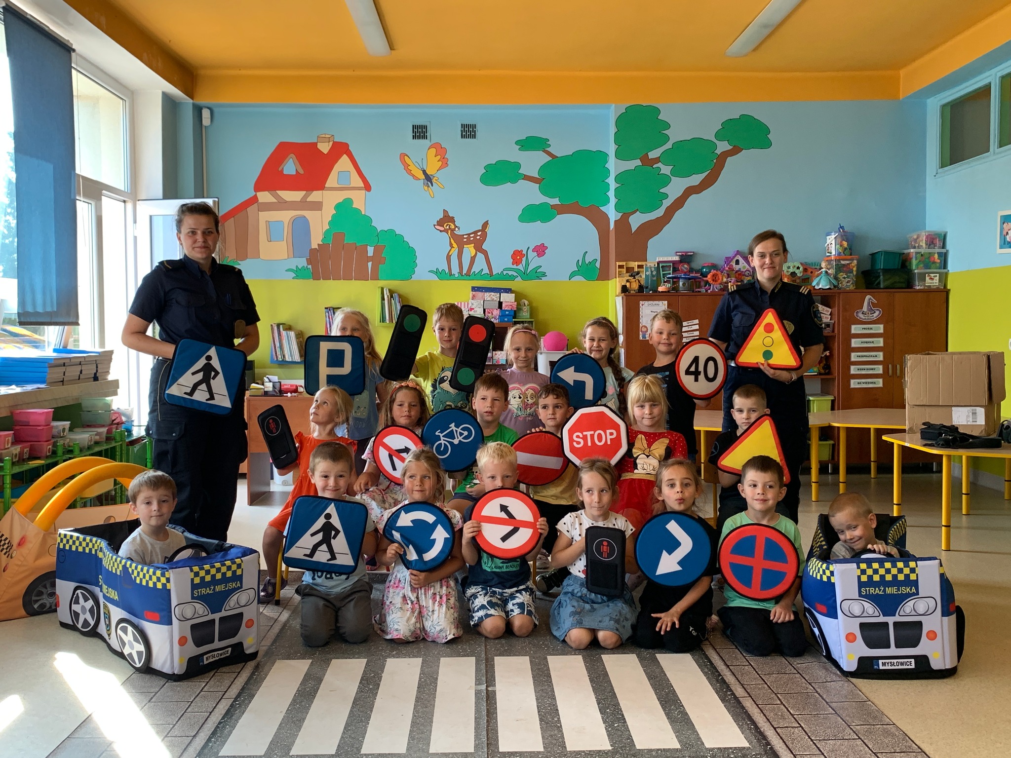 W minionych tygodniach funkcjonariuszki Mysłowickiej Straży Miejskiej przeprowadziły zajęcia profilaktyczne z udziałem Zestawu Miasteczko Umiejętności Drogowych ”AUTOCHODZIK”.Program miał na celu edukację przedszkolaków w zakresie bezpiecznego zachowania się na drodze. Omawiane były z dziećmi poszczególne znaki drogowe oraz reguły obowiązujące przy korzystaniu z przejść dla pieszych z sygnalizacją świetlną i bez niej. Podczas zajęć dzieci korzystały z miasteczka drogowego i w kontrolowanych warunkach utrwalały wiedzę, którą zdobyły.
