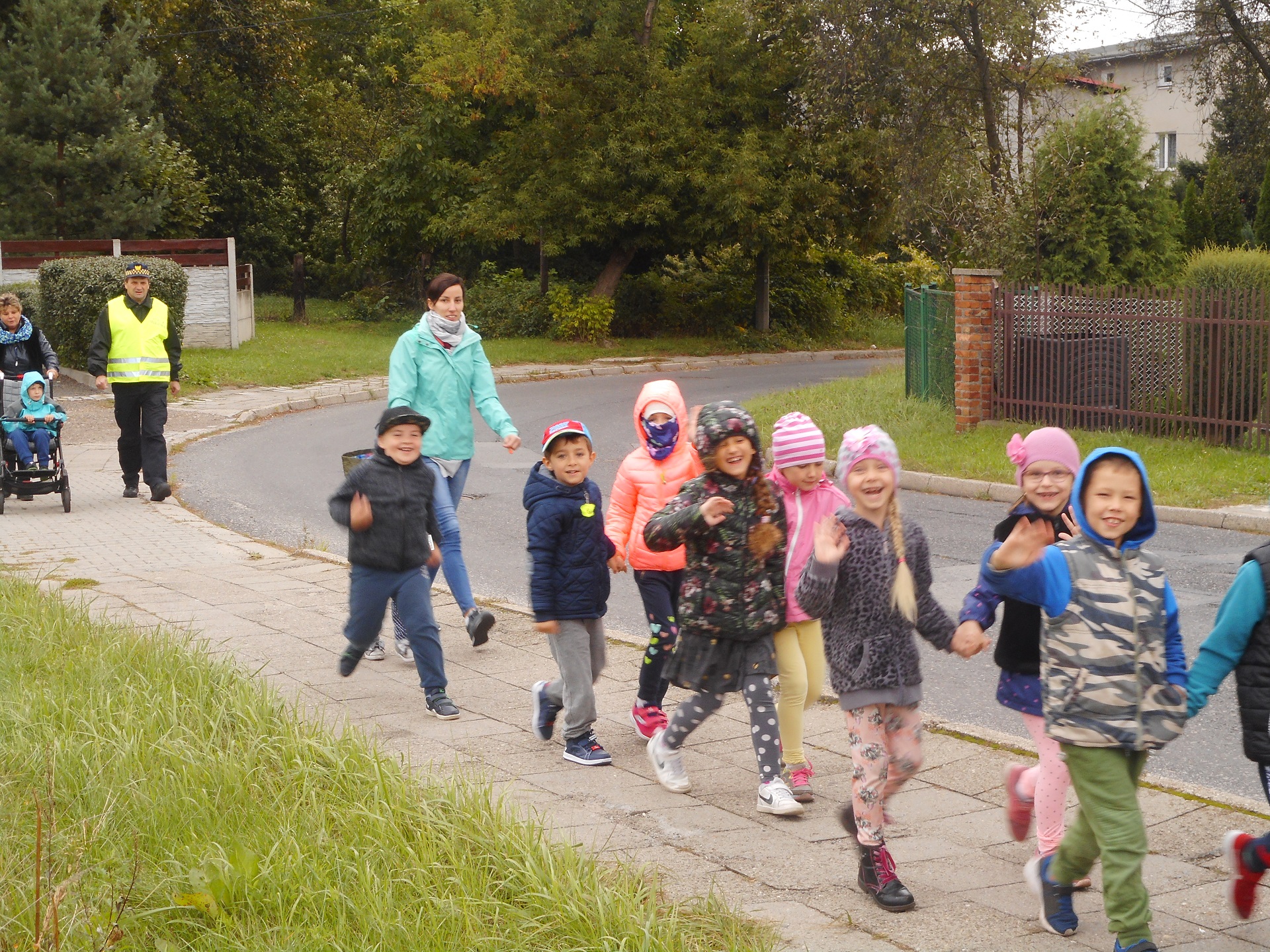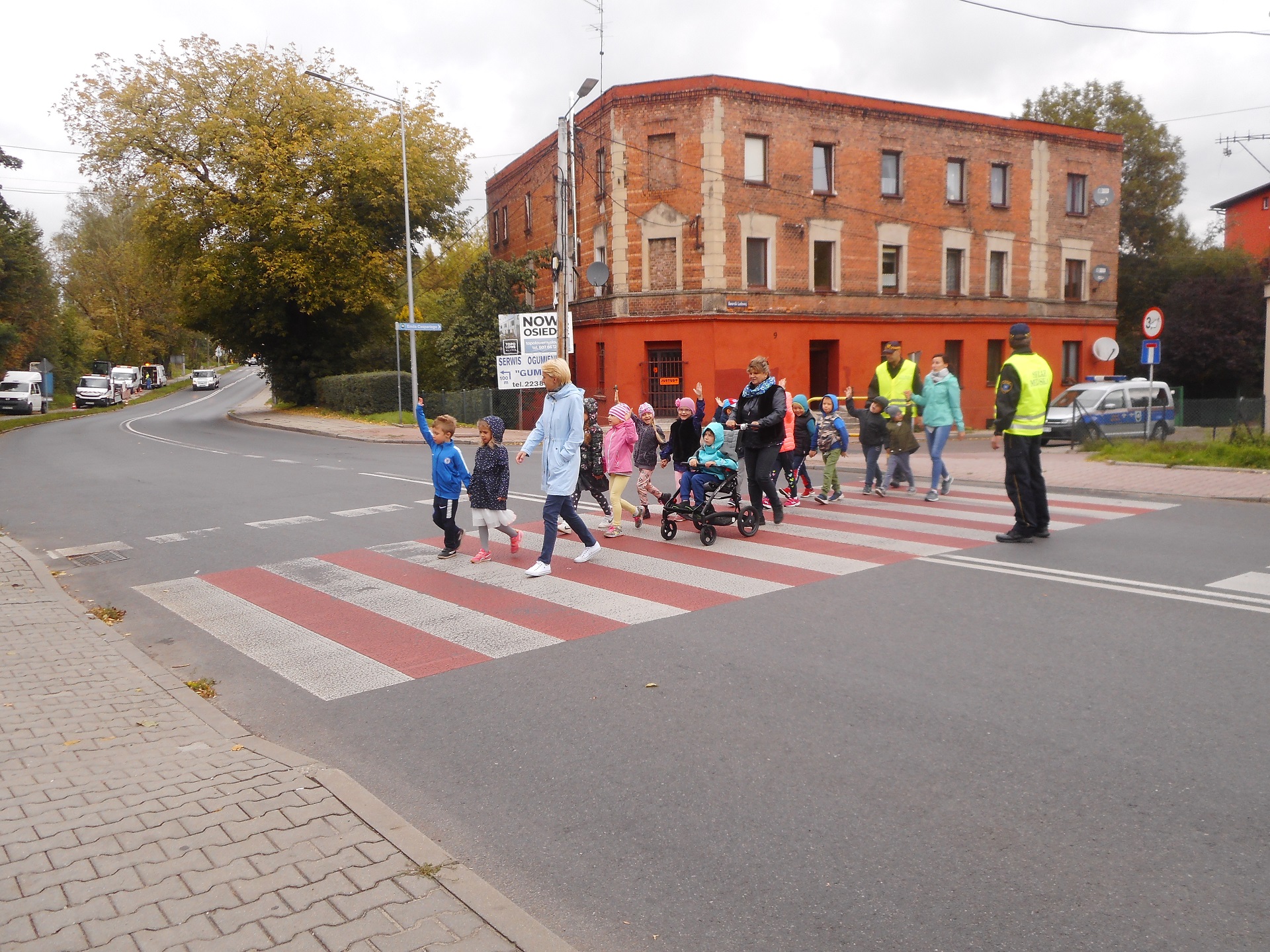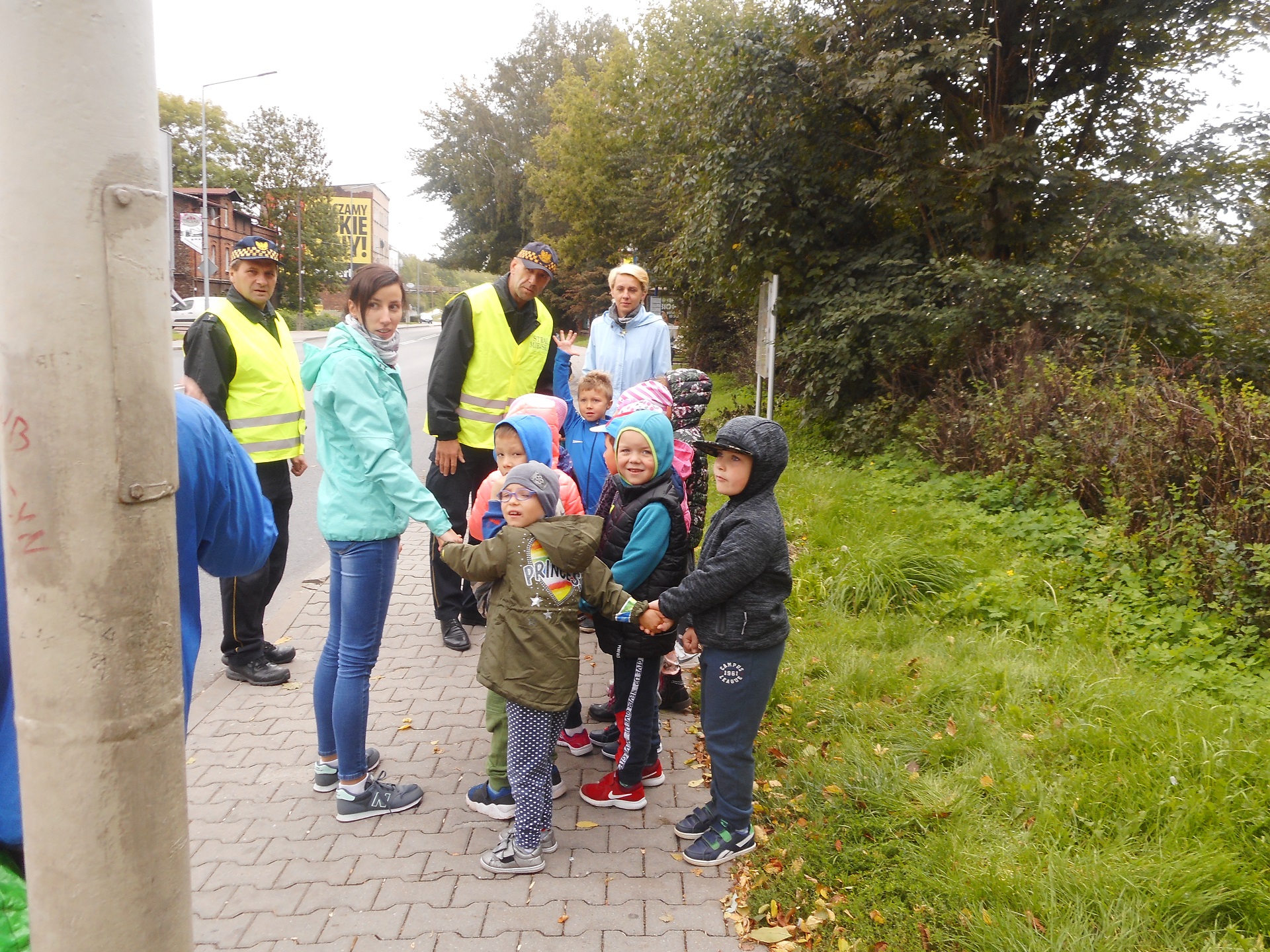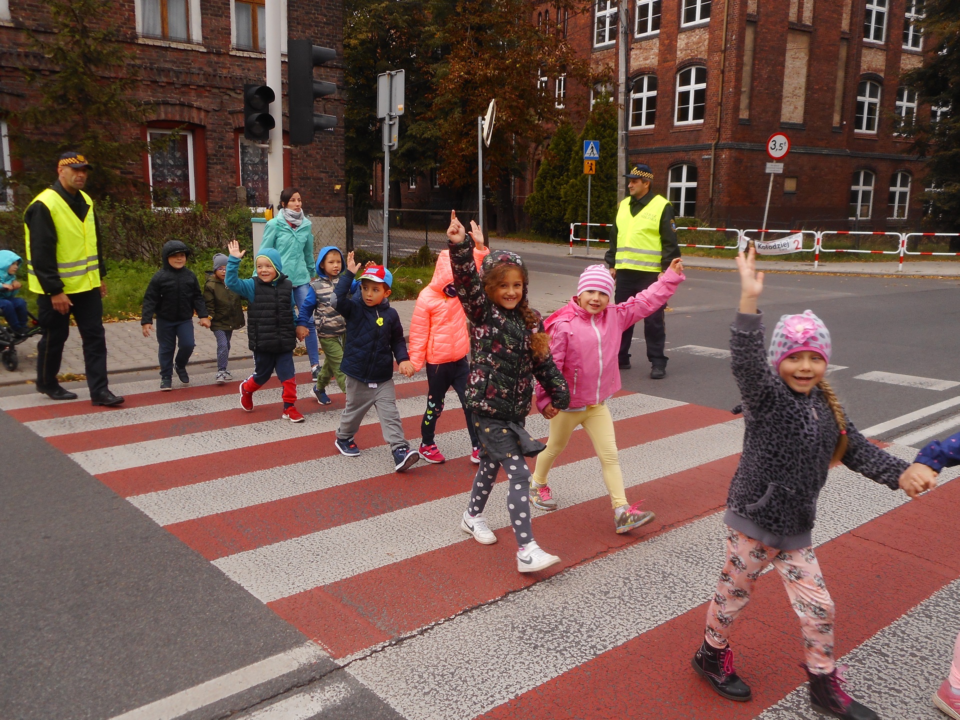Dzisiaj nasi funkcjonariusze uczyli dzieci z Przedszkola nr 7 na ulicy Portowej bezpiecznego poruszania się po drodze. Podczas wspólnego spaceru przypomnieli przedszkolakom zasady przechodzenia przez przejście dla pieszych z sygnalizacją świetlną. Dzieci utrwaliły sobie, że na czerwonym świetle stoimy i czekamy na przejście przez jezdnię, a przechodzimy na świetle zielonym oraz że dodatkowo podczas przechodzenia podnosimy rękę do góry, aby być lepiej widocznymi.