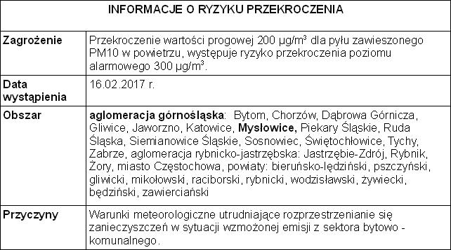 Co jakiś czas na stronie Wojewódzkiego Inspektoratu Ochrony Środowiska w Katowicach pojawiają się komunikaty o ryzyku wystąpienia przekroczenia poziomu alarmowego dla pyłu zawieszonego PM10 w powietrzu, takie jak zamieszczone poniżej.