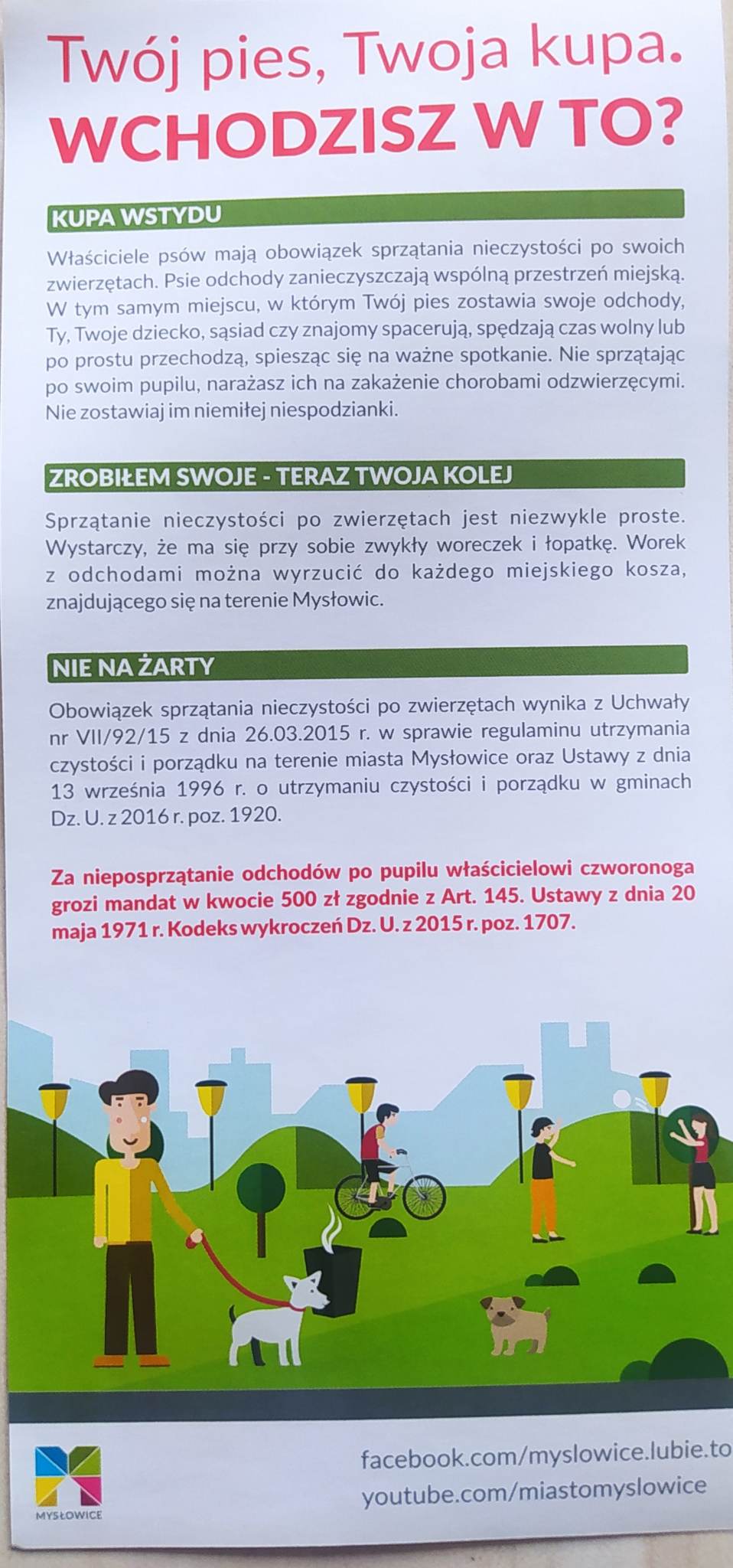 Straż Miejska Mysłowice przypomina – osobie sprawującej opiekę nad czworonogiem, za nieposprzątaie odchodów, grozi mandat w wysokości 500 zł z Art. 145 Kodeksu Wykroczeń.