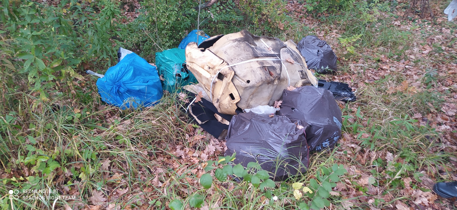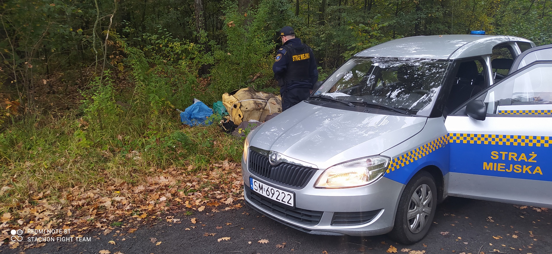 W dniu 13.10.21r podczas patrolu miasta Mysłowie, strażnicy miejscy na terenach leśnych przy ul. Mikołowskiej (okolice wiaduktu) zauważyli pryzmę śmieci w postaci elementów tapicerek samochodowych oraz 6 worków ze śmieciami, w których znajdowały się części mechaniczne pojazdów tj. wentylatory, chłodnice, magistrale olejowe oraz termostaty. Śmieci zalegały w miejscu, które prowadzi z Mysłowickiego lasu do Katowic, gdzie poruszają się ludzie podczas wędrówek rowerowych oraz uprawiania aktywności sportowych.