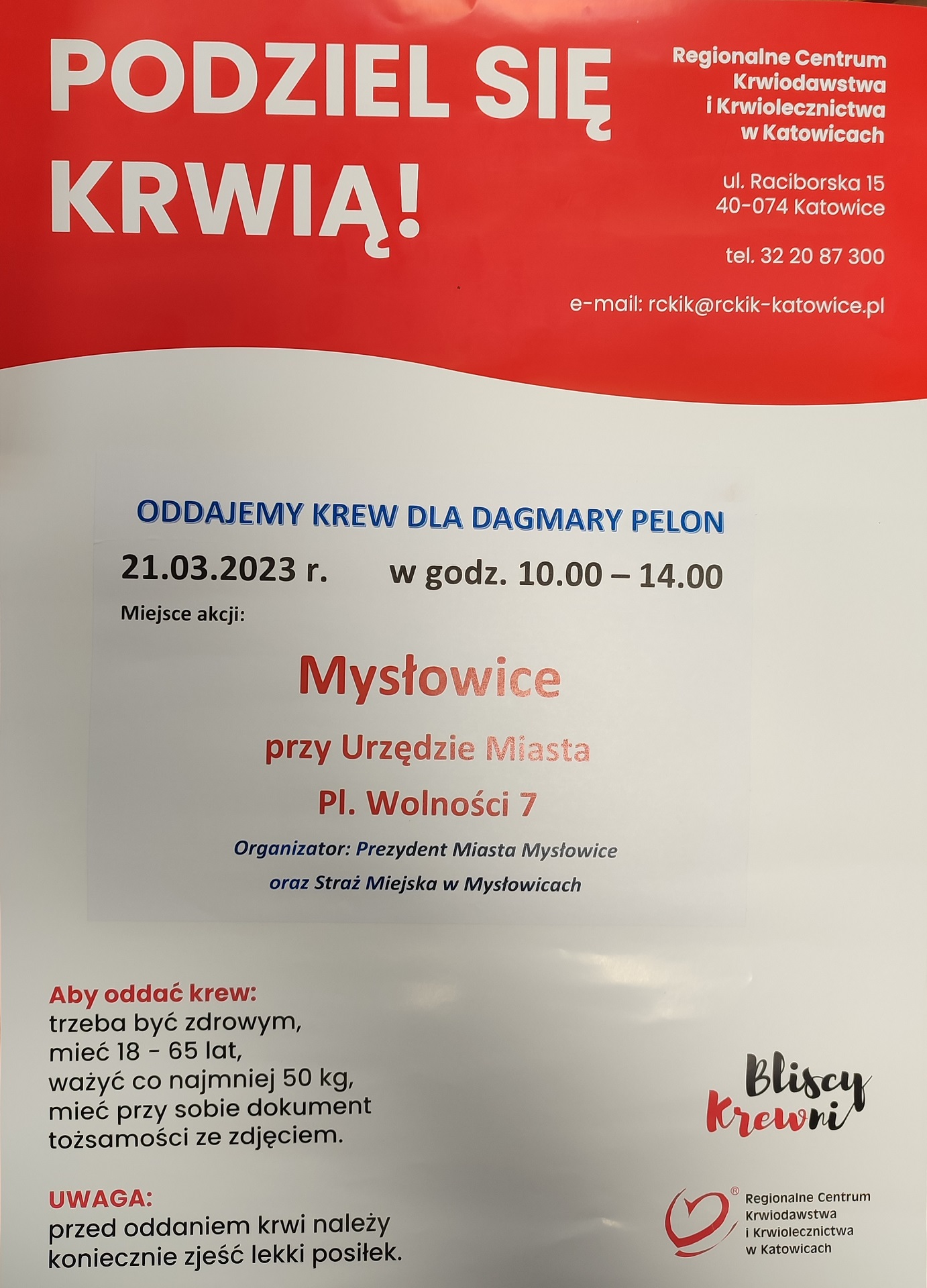 We wtorek 21-go marca, w godz. od 10-ej do 14-ej przy Urzędzie Miasta – ul. Pl. Wolności 7 – będzie można oddawać krew. Tym razem będzie to zbiórka celowa na rzecz naszej serdecznej koleżanki Dagmary – pracownicy Straży Miejskiej Mysłowice.